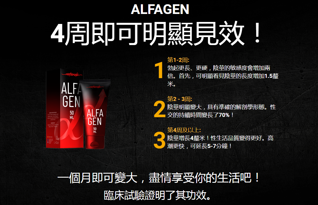 The appetite for sex will increase and the sensations will be more intense. AlfaGen is safe for health because it contains only natural ingredients. In addition, its cream consistency is patchy and pleasant to apply. It is enough to massage it into the genital area and wait for the results. The product guarantees an increase in libido, orgasms, and a larger member size! AlfaGen is innovative and effective! I recommend it to men who want to enjoy sex again.