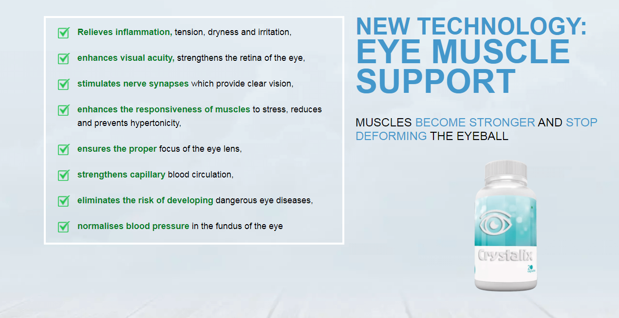 Crystalix Relieves tension and pain in the eyes in 5 minutes, Restores 99% of vision during the 1st course, Prevents the development of eye diseases and weakening of vision. Crystalix eye health supplement has been around for some time now and customer reviews on this product suggests that it is highly beneficial for the eyes. The product has been tested and clinically proven to improve eye health. In fact, it is an advanced formula which has received positive feedback from thousands of users.