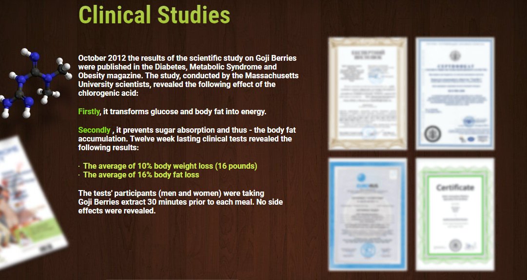Goji Berries is definitely the most important among the recent discoveries in the sphere of dietology. The combination of betaine and amino acids makes it the most powerful natural fat burner. The product has successfully passed a wide range of the international clinical tests, which testified it safety and efficiency.